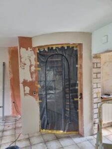 Einbau einer Treppenhausabtrennung für eine Einliegerwohnung mit einer von Hand gefertigten Massivholz- Schiebetür.